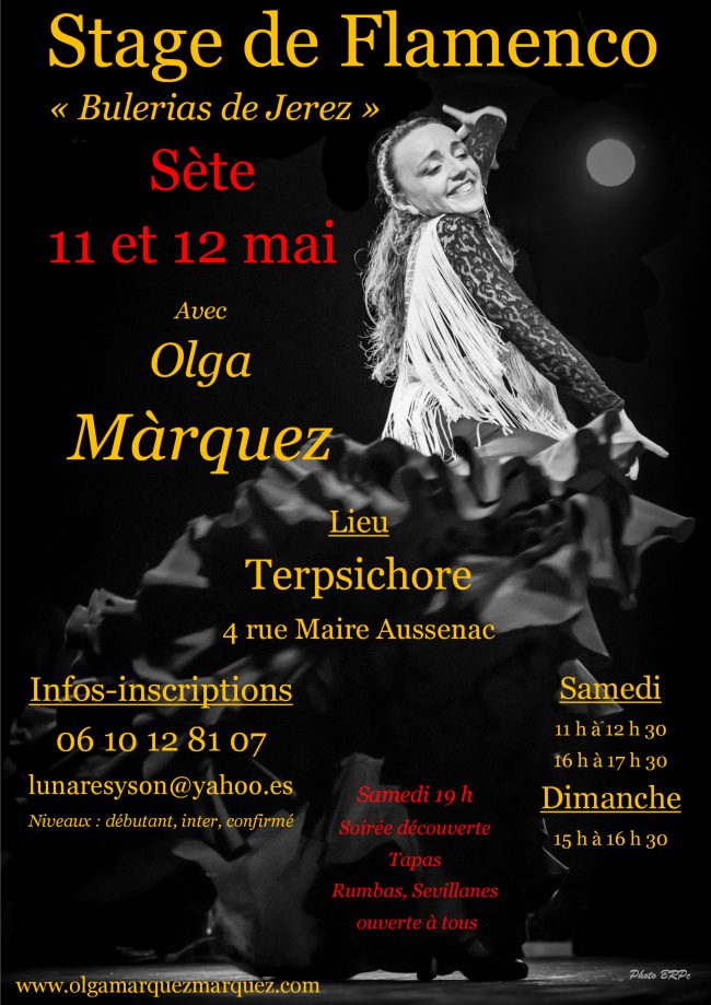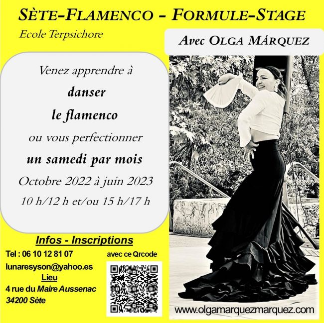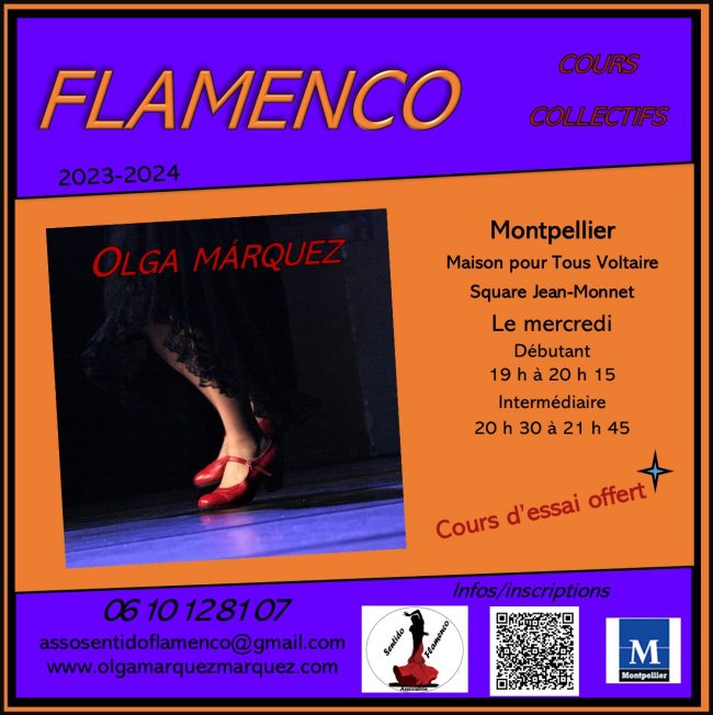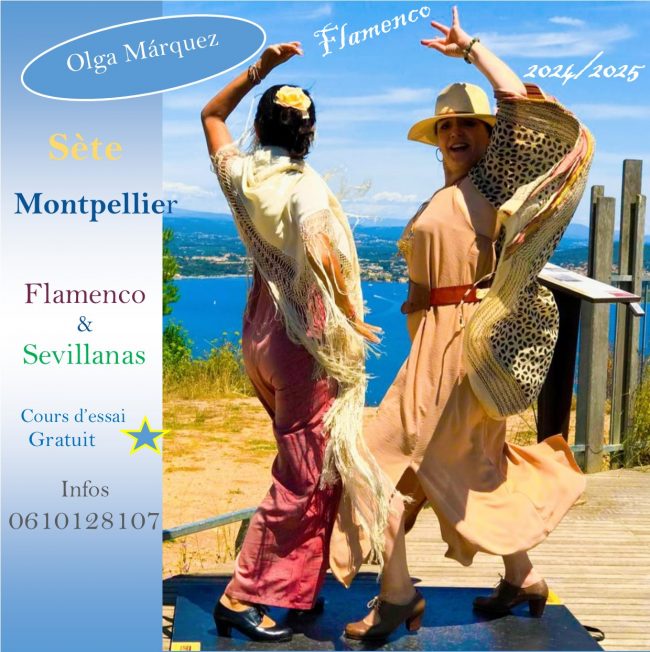 Cours de Flamenco et Sevillanas animés par Olga Márquez, tous niveaux, tous âges. Cours d’essai gratuit. FLAMENCO À Sète Centre de Danse Arnal-Ibanez Le lundi de 20 h 45 à 22 h Infos et inscriptions À Montpellier Maison pour tous Voltaire Le mercredi 1er niveau : 19 h à 20 h 15 2em niveau…